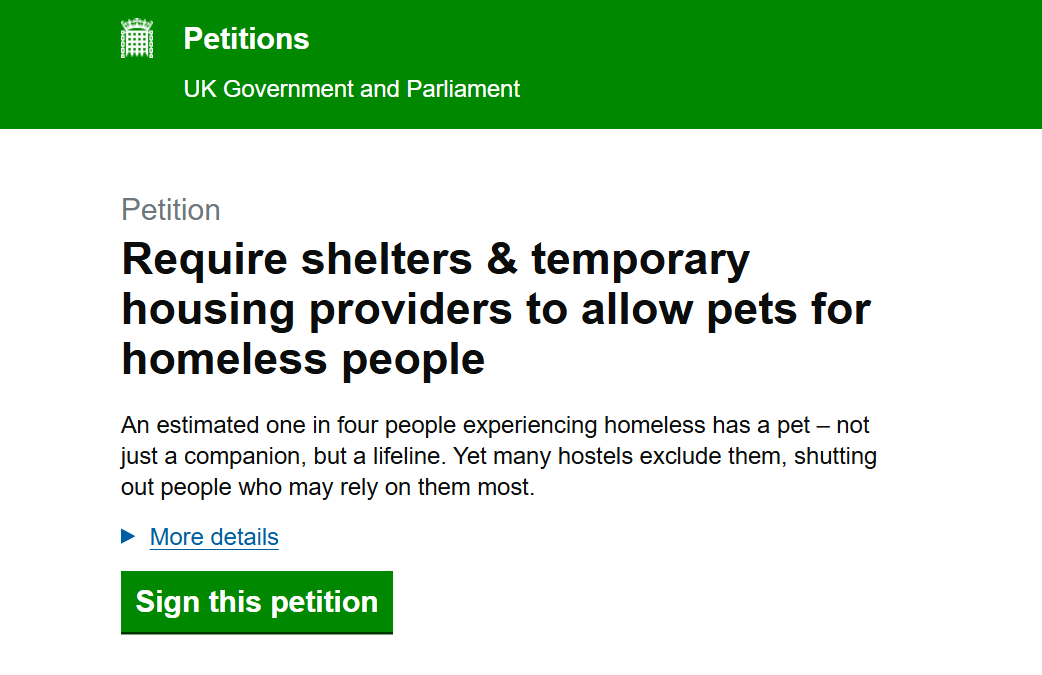 This is why we started a national petition calling for pet-inclusive housing to be properly recognised within homelessness and housing policy. It’s part of a wider conversation about how systems can better reflect real life.